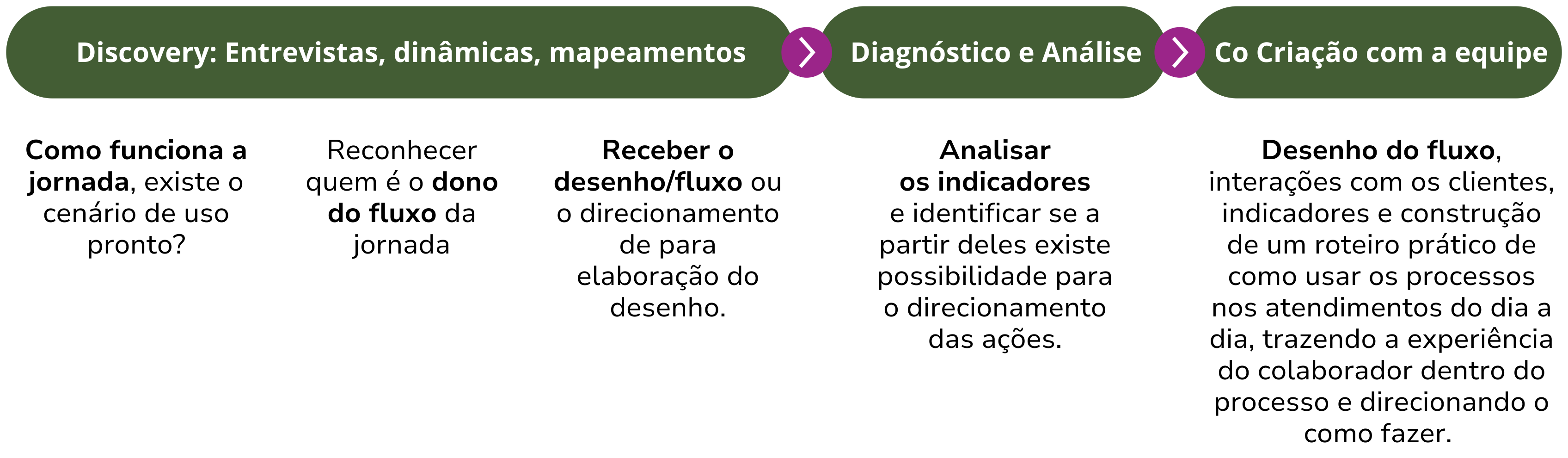 Desenho do fluxo, interações com os clientes, indicadores e construção de um roteiro prático de como usar os processos nos atendimentos do dia a dia, trazendo a experiência do colaborador dentro do processo e direcionando o como fazer.